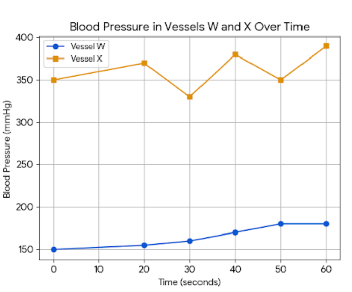 In an investigation, blood flowing in two blood vessels, W and X of a healthy adolescent was measured within a minute and recorded as shown below.