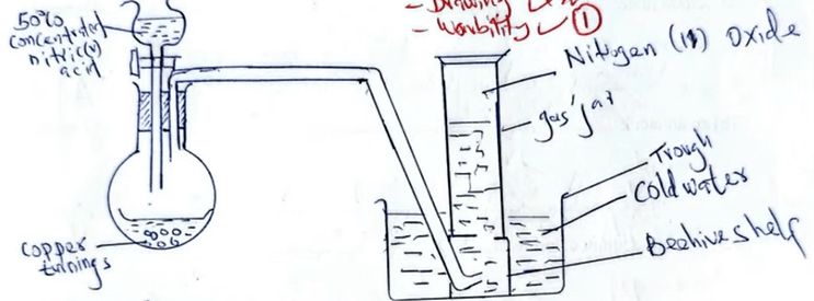 11. Nitrogen (II) oxide can be prepared by reacting copper turnings \( \mathrm{Cu}(s) \) with nitric (V) acid \( \mathrm{HNO_3}(aq) \).