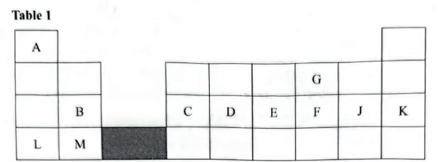 1. Use the section of the periodic table in Table 1 to answer the questions that follow. The letters are not the actual symbols of the elements.